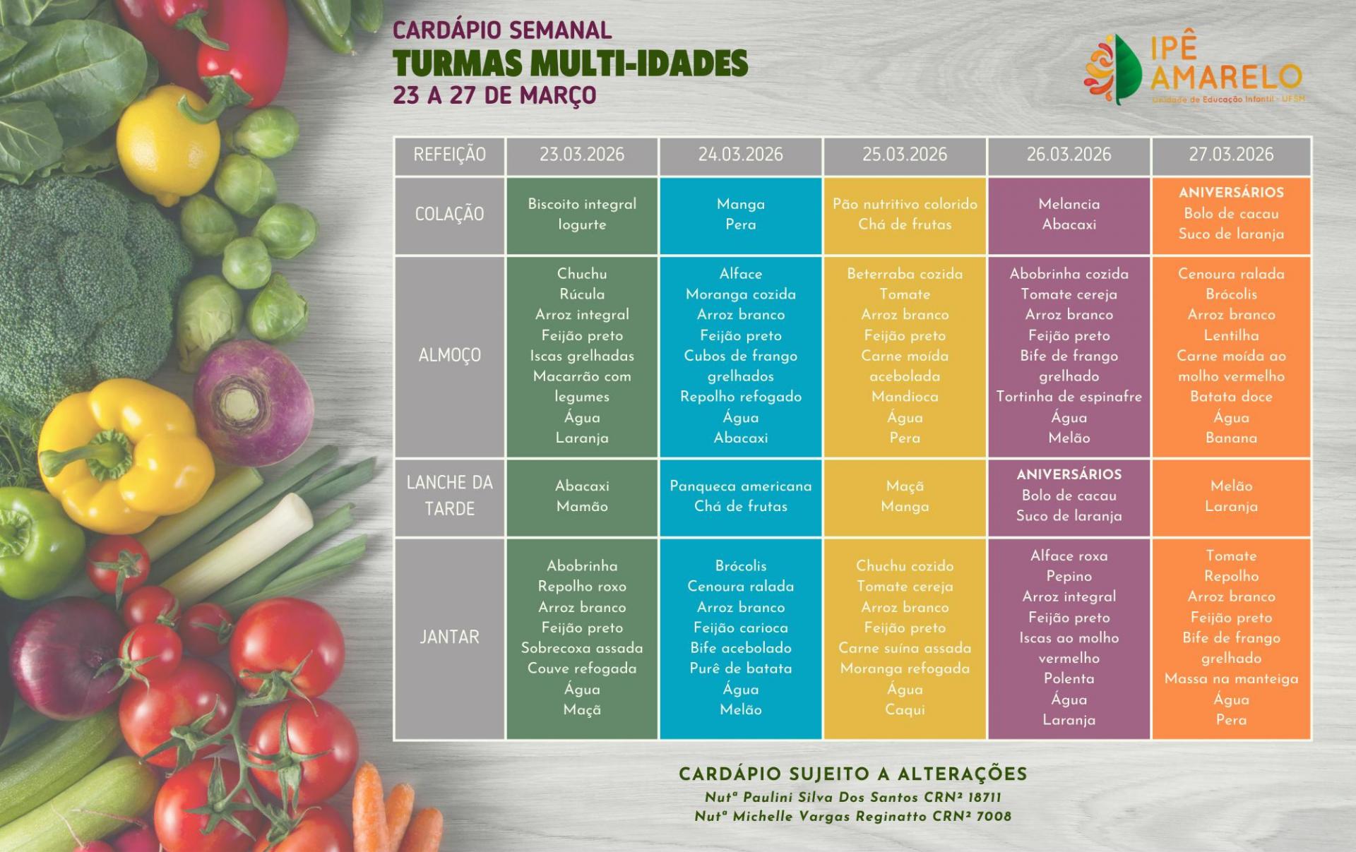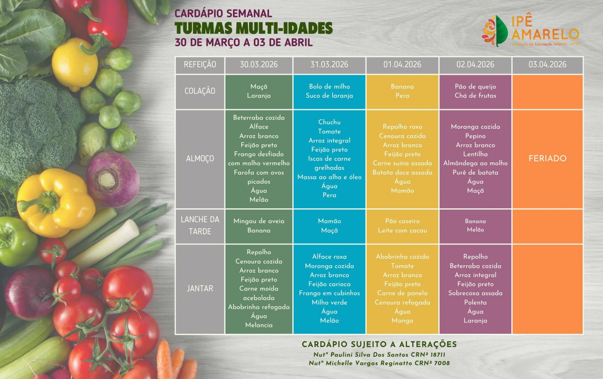 O cardápio das Turmas Multi-idades é composto por 4 refeições: colação, almoço, lanche da tarde e jantar. A carne é servida picada e a consistência dos alimentos é adequada para esta faixa etária.