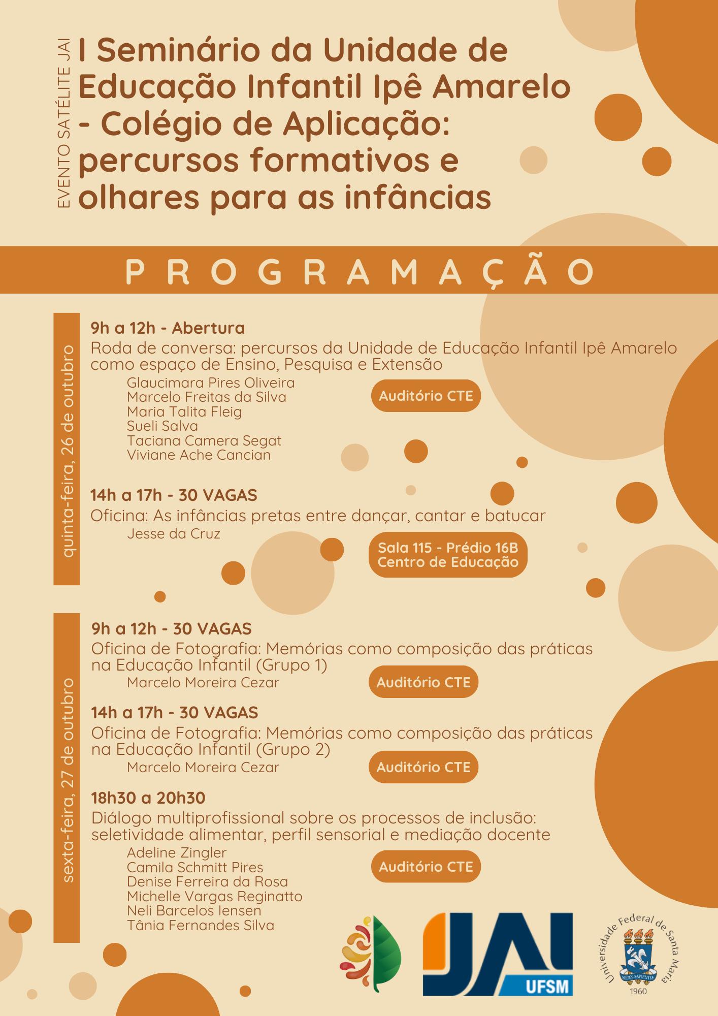 O primeiro Seminário da Unidade de Educação Infantil Ipê Amarelo – Colégio de Aplicação: Percurso Formativo e Olhares para a Infância é um evento científico promovido pela Equipe da UEIIA-UFSM. O Seminário será composto por rodas de conversas e oficinas. O evento faz parte da Jornada Acadêmica Integrada da UFSM.