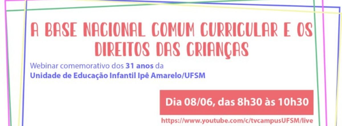 A Unidade de Educação Infantil Ipê Amarelo, juntamente com a Universidade Federal de Santa Maria, e em parceria com o Fórum Gaúcho de Educação Infantil, a Prefeitura Municipal de Santa Maria, o Núcleo de Estudos e Pesquisas em Educação Infantil – NEPEI (UFSM), o Programa Conexão de Saberes, da Secretaria Municipal de Educação, e o Centro de Educação da UFSM,  realizará, no dia 08 de junho, das 08:30 às 10:30, a Webinar comemorativa dos 31 anos da unidade, com o tema “A Base Curricular e os Direitos das Crianças”.