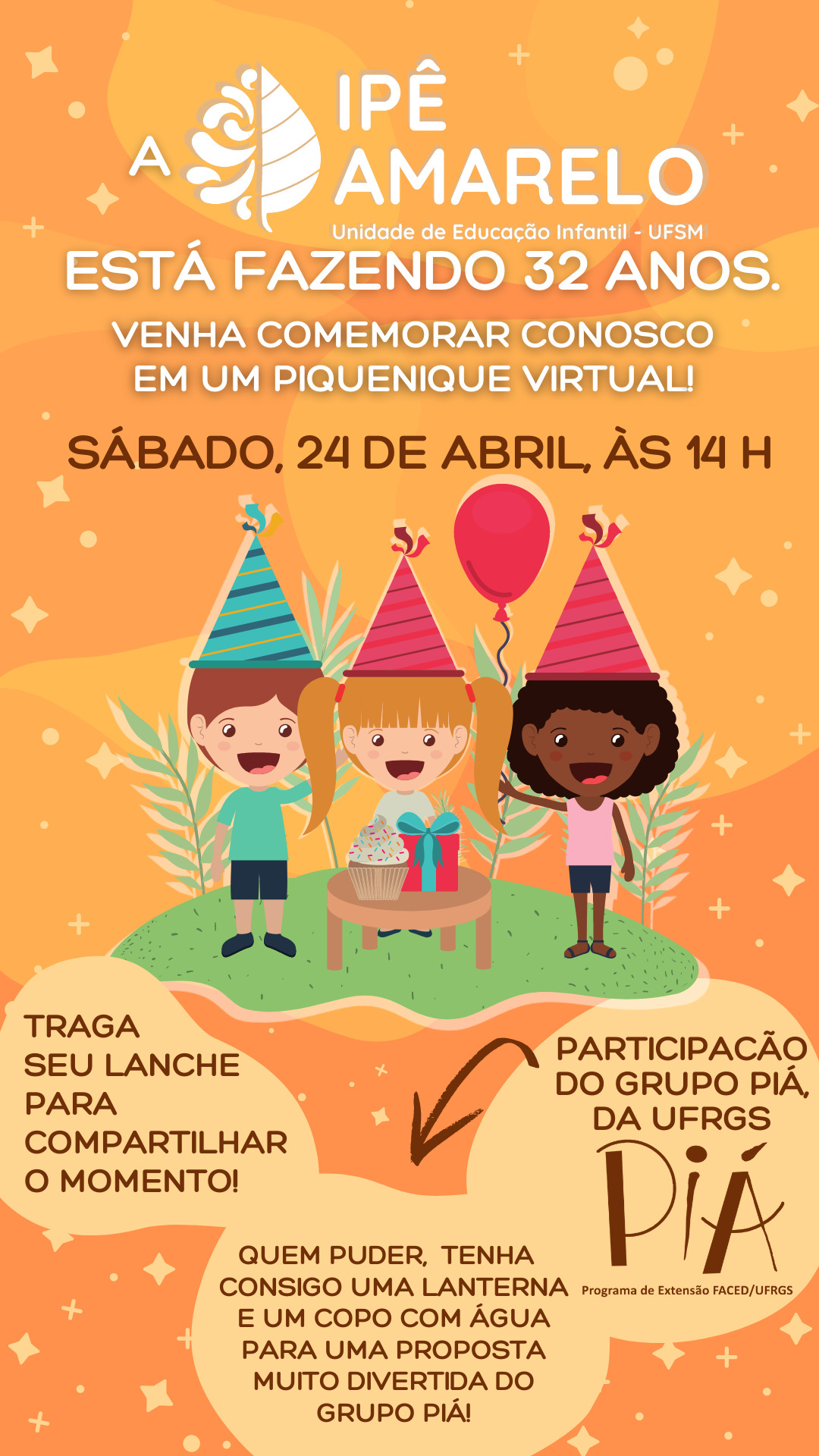 O piquenique de aniversário da Ipê Amarelo vai acontecer amanhã, sábado, dia 24, às 14 horas, via Google Meet.