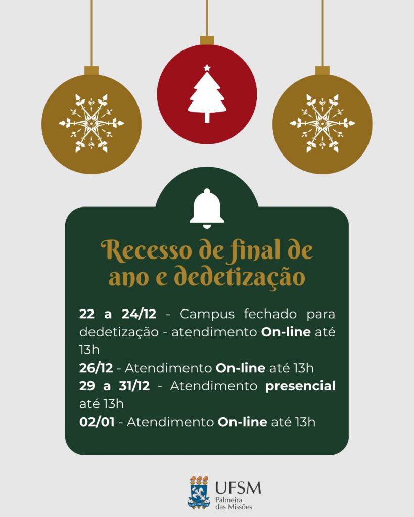 A UFSM Palmeira das Missões informa que, conforme as diretrizes da Portaria Normativa N. 100/2025 da UFSM, o recesso de final de ano dos servidores seguirá os períodos definidos no…