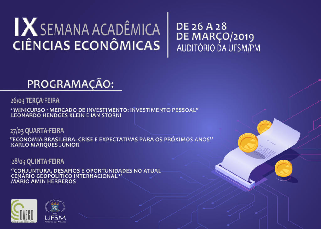 O curso de Ciências Econômicas, do campus da UFSM de Palmeira das Missões, convida os alunos, docentes e toda a comunidade acadêmica e regional a participarem da IX Semana Acadêmica do curso de Ciências Econômicas.
