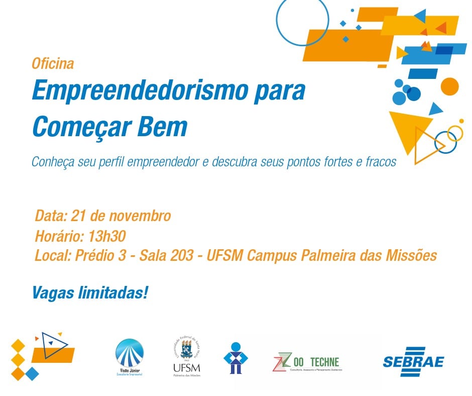 Na próxima quinta-feira (21) será realizada na UFSM-PM a Oficina “Empreendedorismo para começar bem – conheça seu perfil empreendedor e descubra seus pontos fortes e fracos”. A atividade, promovida pelo Diretório Acadêmico de Administração, Visão Júnior, Zoo Techne Jr. e Sebrae será realizada em dois turnos, sendo pela tarde às 13h30min e à noite às 19h30min, na sala 203 do prédio 3.
