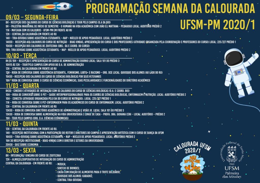 As atividades da Calourada UFSM 2020 seguem até 17 de março e são organizadas pela Pró-Reitoria de Assuntos Estudantis (Prae), Gabinete do Reitor e Unidade de Comunicação Integrada (Unicom).