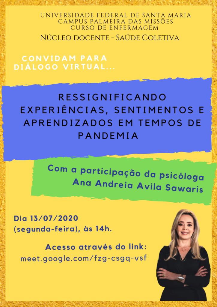 Na próxima segunda-feira (13), às 14h, o Núcleo Docente de Saúde Coletiva do curso de Enfermagem da UFSM-PM promove a Live “Ressignificando experiências, sentimentos e aprendizados em tempos de pandemia”.