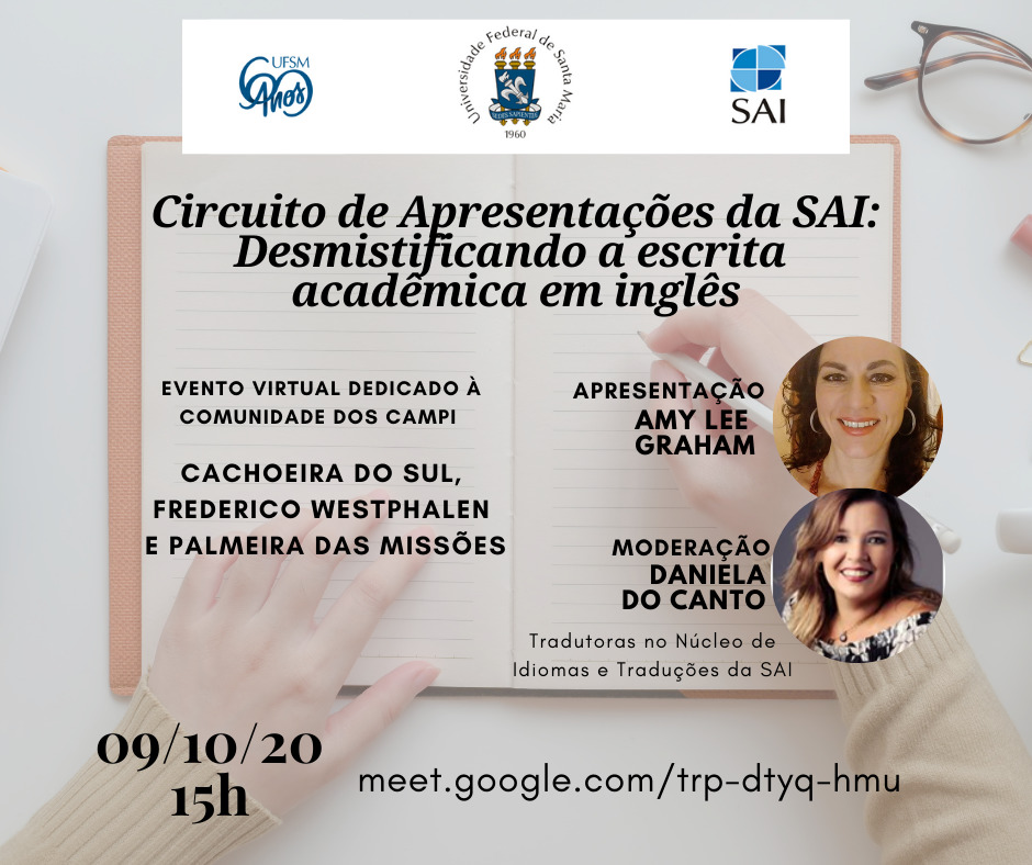 A Secretaria de Apoio Internacional da UFSM realiza nesta sexta-feira (09), às 15h, o evento “Circuito de Apresentações da SAI: Desmistificando a escrita acadêmica em inglês”. O encontro ocorrerá através da Google Meet (meet.google.com/trp-dtyq-hmu) e faz parte de uma série de eventos virtuais que tem o objetivo de apresentar os serviços prestados pela SAI e fomentar o entendimento e a cultura da internacionalização dentro da UFSM.