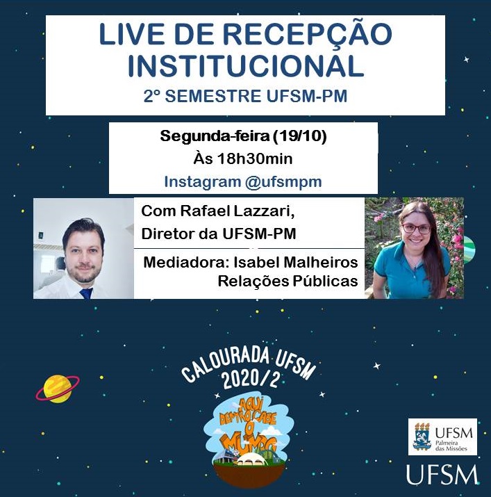 A Direção da UFSM-PM promove na próxima segunda-feira (19), às 18h30min, uma Live para recepcionar os discentes, docentes e técnico-administrativos em educação para o 2º semestre que inicia em outubro, devido à pandemia do novo coronavírus.