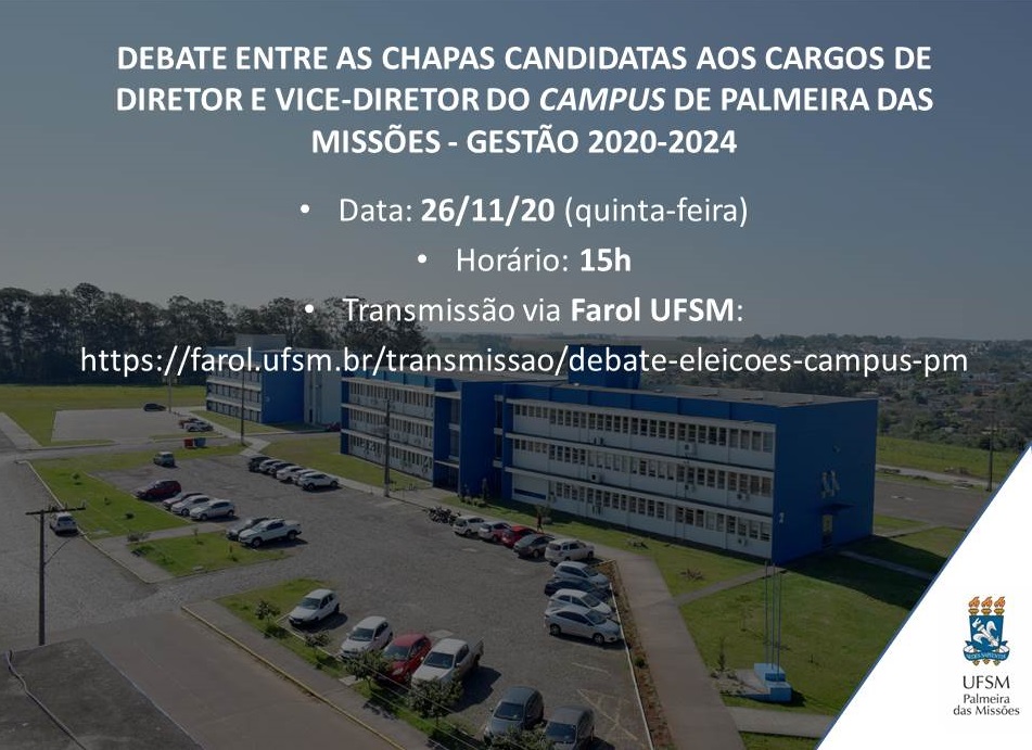 O debate entre as chapas candidatas aos cargos de diretor e vice-diretor do campus de Palmeira das Missões – Gestão 2020-2024, acontece nesta quinta-feira (26), às 15h, com transmissão via Farol UFSM.