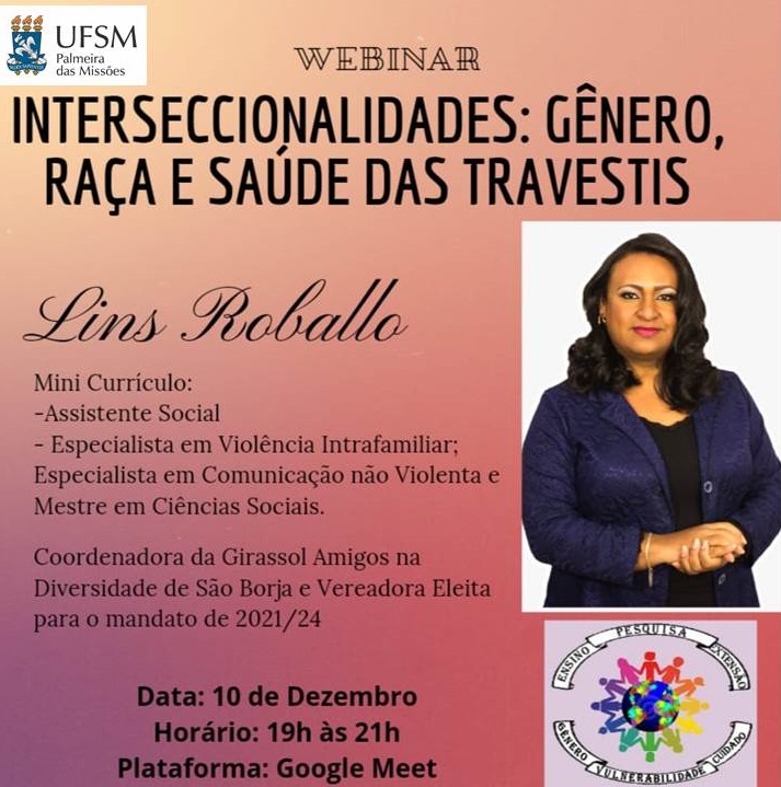 O Grupo de Ensino Pesquisa e Extensão em Gênero, Vulnerabilidade e Cuidado em Saúde (GENVULC), vinculado ao curso de Enfermagem da UFSM-PM, promove nesta quinta-feira (10), às 19h, a Webinar “Interseccionalidades: Gênero, Raça e Saúde das Travestis”.