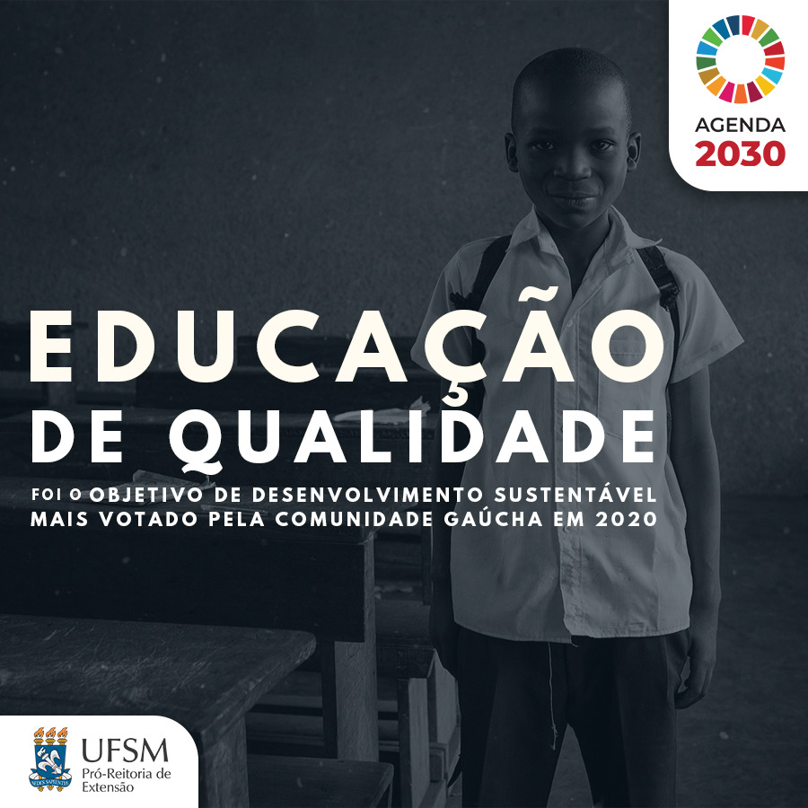 A Pró-Reitoria de Extensão da UFSM divulgou nessa segunda (21) o resultado do Fórum Regional Permanente de Extensão 2020. Contado com a participação de mais de 5 mil votos, os quatro campi da instituição (Cachoeira do Sul, Frederico Westphalen, Palmeira das Missões e Santa Maria) elegeram o Objetivo de Desenvolvimento Sustentável (ODS) 04 – Educação de Qualidade como eixo prioritário para as ações da UFSM na sociedade. Esse foi o primeiro ano que a Universidade utilizou a Agenda 2030 – protocolo assinado por 193 países para a promoção do desenvolvimento sustentável no mundo – como forma de ouvir as demandas da população das quatro cidades que abrigam os campi da instituição, uma iniciativa inédita se tratando da temática no Brasil.