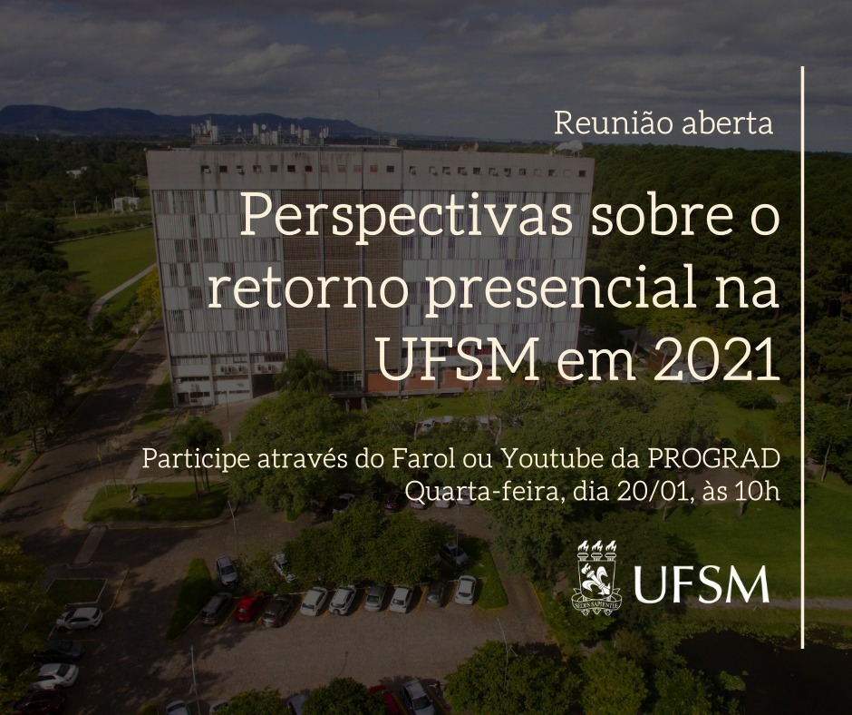 Desde março de 2020, a UFSM está sob o regime remoto, sem atividades acadêmicas e administrativas presenciais. Diante deste cenário e das incertezas do momento, na próxima quarta-feira (20), às 10h, ocorrerá a reunião aberta “Perspectivas sobre o retorno presencial na UFSM em 2021”, para debater as possibilidades para o novo ano na Universidade.
