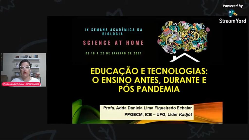 Referente a esse último tema, a palestra “Educação e tecnologias: o ensino antes, durante e pós-pandemia”, foi ministrada pela docente Adda Echalar. Ada é professora da Universidade Federal de Goiás (UFG) e líder do grupo de estudos e pesquisas “Kadjót”, que estuda as relações entre as tecnologias e a educação. A pesquisadora trouxe muitas reflexões sobre a relação entre o uso das tecnologias com a educação, como esta inovação tecnológica interfere na qualidade do ensino e, também, como a pandemia interferiu neste aspecto. A palestrante abordou ainda questões relacionadas à desigualdade social, reforçada pelo contexto da pandemia; dificuldades de acesso dos alunos às tecnologias de informação e comunicação (TICs), e sobre a dificuldade que muitos professores estão enfrentando devido a esse contexto pandêmico.