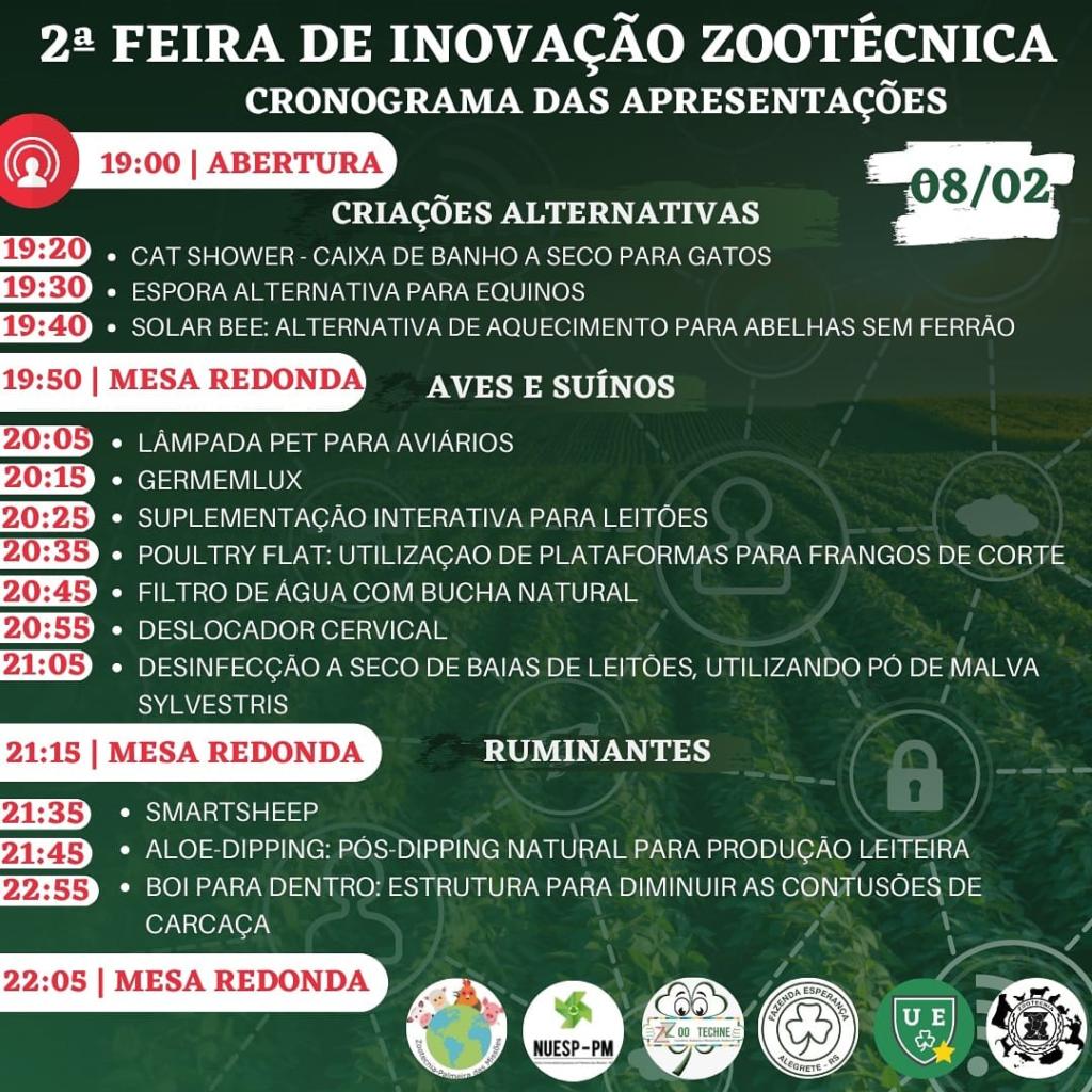 Acontece nesta segunda-feira (08), de maneira virtual, a 2ª Feira de Inovação Zootécnica da UFSM-PM. O evento é resultado dos trabalhos realizados na disciplina de Inovações Zootécnicas, ministrada pelo professor Rodrigo Borille, do curso de Zootecnia. As atividades foram desenvolvidas nas áreas de monogástricos, ruminantes e criações alternativas.