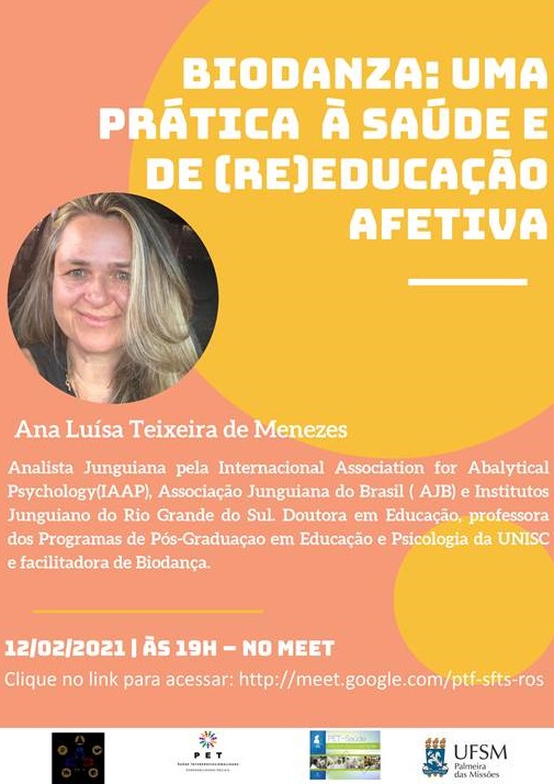 O grupo de estudo formado por integrantes dos Eixos Vulnerabilidades Sociais e Práticas Integrativas e Complementares em Saúde (INTEGRAVULNERABILIPICS), do Programa PET-Saúde/Interprofissionalidade da Universidade Federal de Santa Maria, campus Palmeira das Missões, convida a comunidade acadêmica, os profissionais dos serviços de saúde e a comunidade geral para uma roda de conversa virtual que terá o tema “Biodanza: uma prática à saúde e de (re) educação afetiva”.
