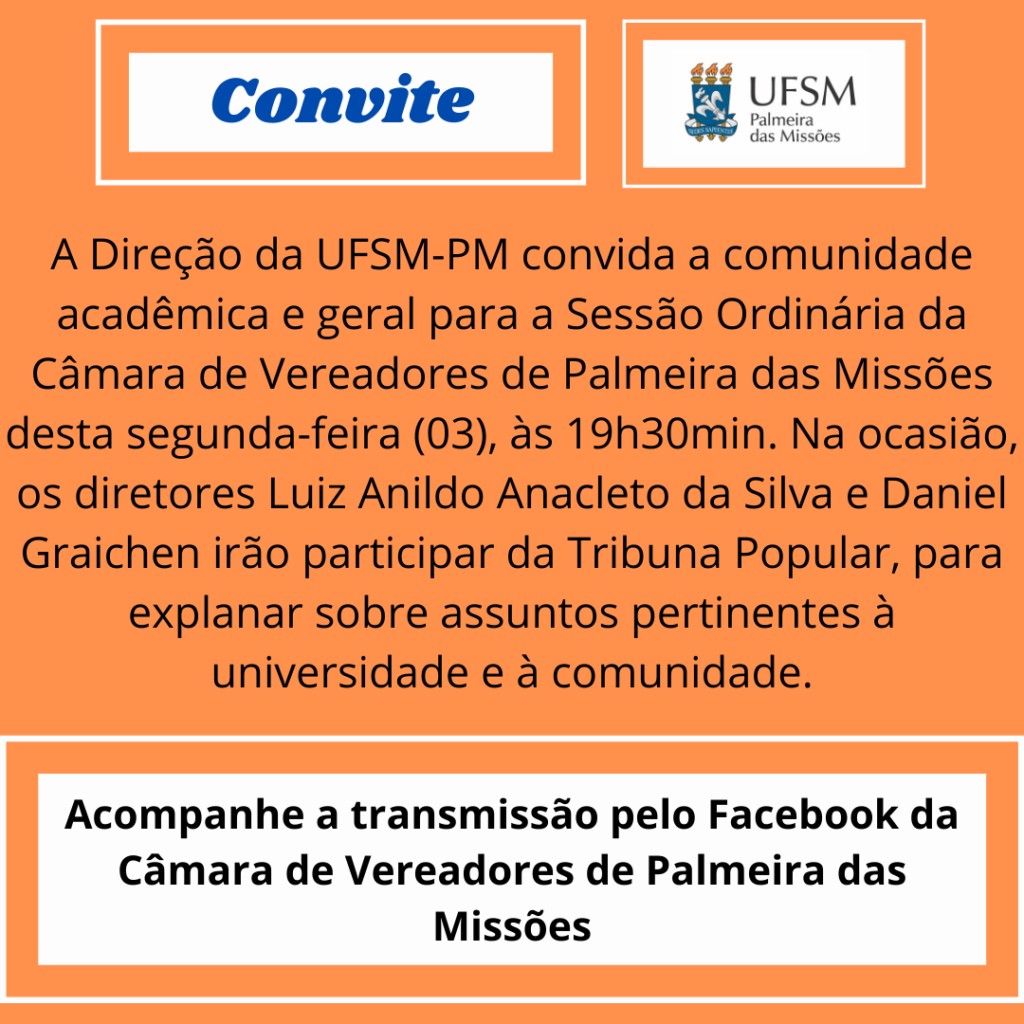 Os diretores da UFSM-PM, professor Luiz Anildo Anacleto da Silva e Daniel Graichen, participam nesta segunda-feira (03), às 19h30min da Sessão Ordinária da Câmara de Vereadores de Palmeira das Missões. Os diretores irão participar da Tribuna Popular para explanar sobre a integração da UFSM com a comunidade palmeirense; a construção de relações com as escolas públicas visando o incentivo aos alunos para ingressar em cursos superiores da UFSM e outros assuntos pertinentes à universidade e à comunidade. A transmissão será realizada através do Facebook da Câmara de Vereadores.