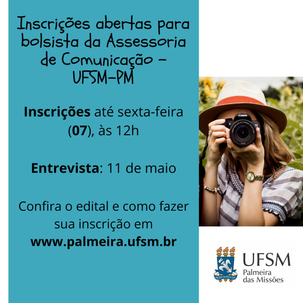 O Núcleo de Divulgação Institucional da UFSM-PM está com inscrições abertas para estudantes que queiram trabalhar como bolsista na Assessoria de Comunicação do campus. Para participar da seleção, o interessado precisa ser aluno de graduação da UFSM Palmeira das Missões; ter domínio do Canva ou outro programa de design; ter conhecimento básico ou interesse em aprender sobre programas de edição de vídeo como, por exemplo, OpenShot ou Shotcut; ter afinidade com postagens em redes sociais e eventos on-line; além de outros pré-requisitos gerais constantes no edital.