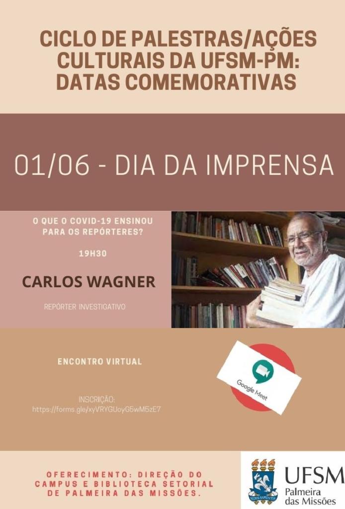 Na próxima terça-feira (01) é comemorado o Dia da Imprensa. Para marcar a data, a Biblioteca Setorial de Palmeira das Missões, juntamente com a Direção da UFSM-PM, promovem o Encontro Virtual “O que a Covid-19 ensinou para os repórteres?”. O evento, que será realizado às 19h30min, terá a presença do repórter investigativo, Carlos Wagner. A atividade faz parte do Ciclo de Palestras/Ações culturais da UFSM-PM: Datas Comemorativas.