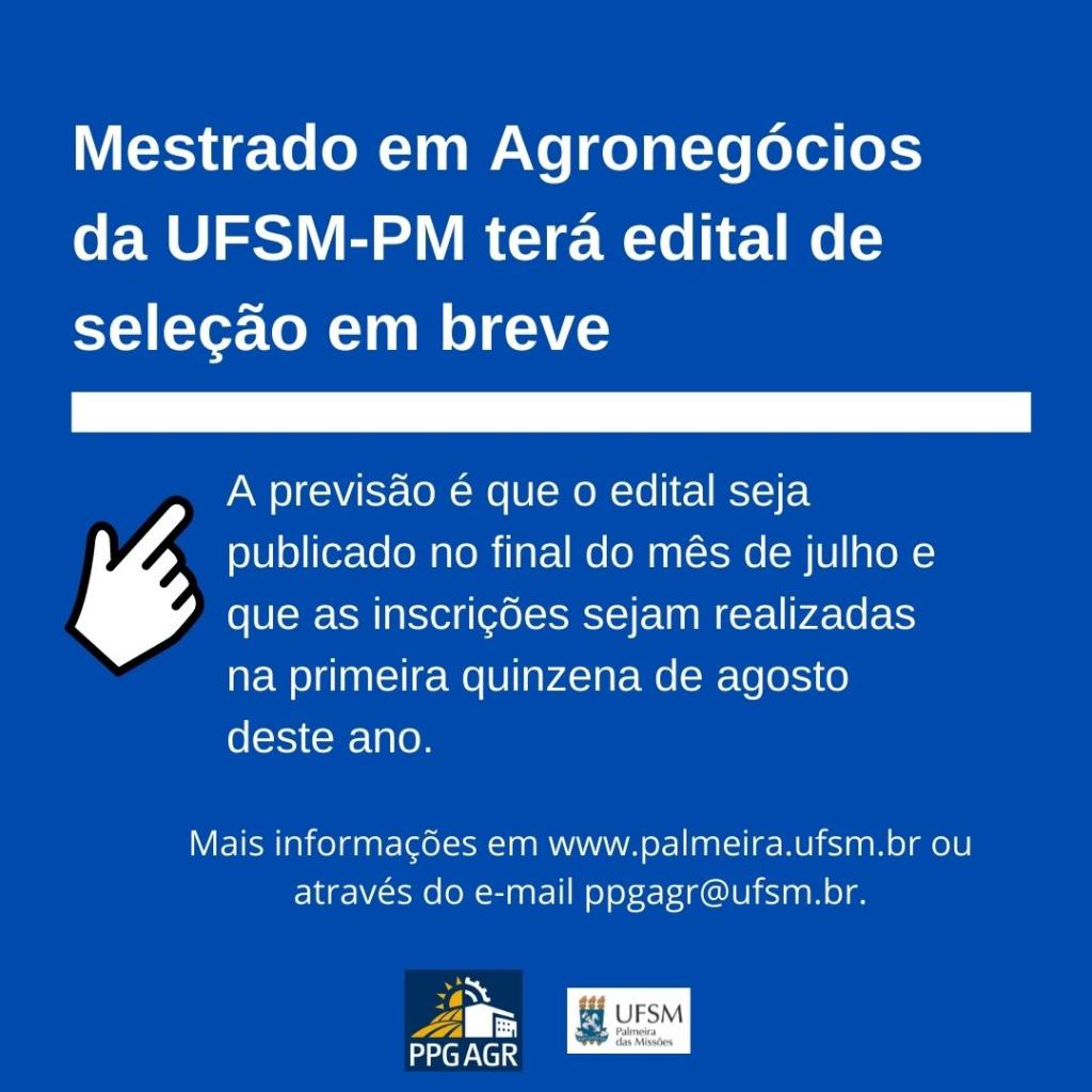 O Programa de Pós-Graduação em Agronegócios da Universidade Federal de Santa Maria, campus Palmeira das Missões, informa que está tramitando nas instâncias da UFSM um novo edital de seleção para ingresso na Pós-Graduação. O colegiado do Programa de Pós-Graduação em Agronegócios aprovou a oferta de vagas, sendo que a minuta de edital está sendo elaborada pela Comissão de Seleção e, em breve, deverá ser divulgada nos meios de comunicação da UFSM.