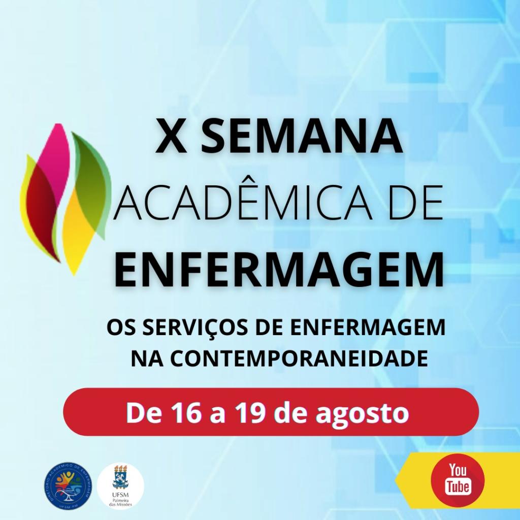 De 16 a 19 de agosto será realizada a 10º Semana Acadêmica do curso de Enfermagem da Universidade Federal de Santa Maria, campus de Palmeira das Missões. O evento deste ano terá como tema “Os Serviços de Enfermagem na Contemporaneidade”. O evento ocorrerá on-line, via canal do YouTube do Diretório Acadêmico Enfermagem UFSM-PM.