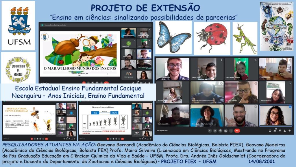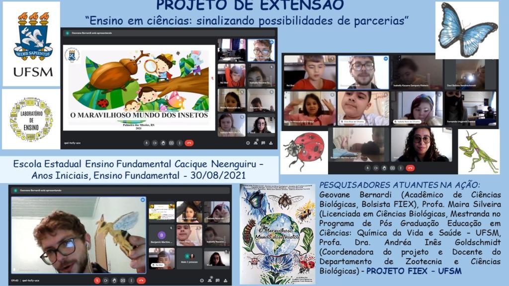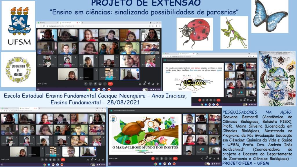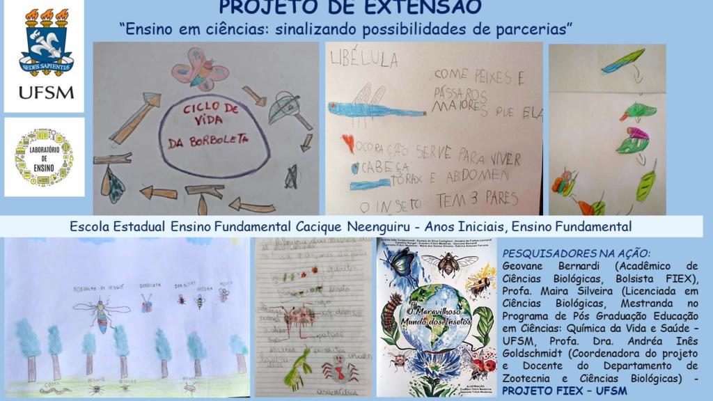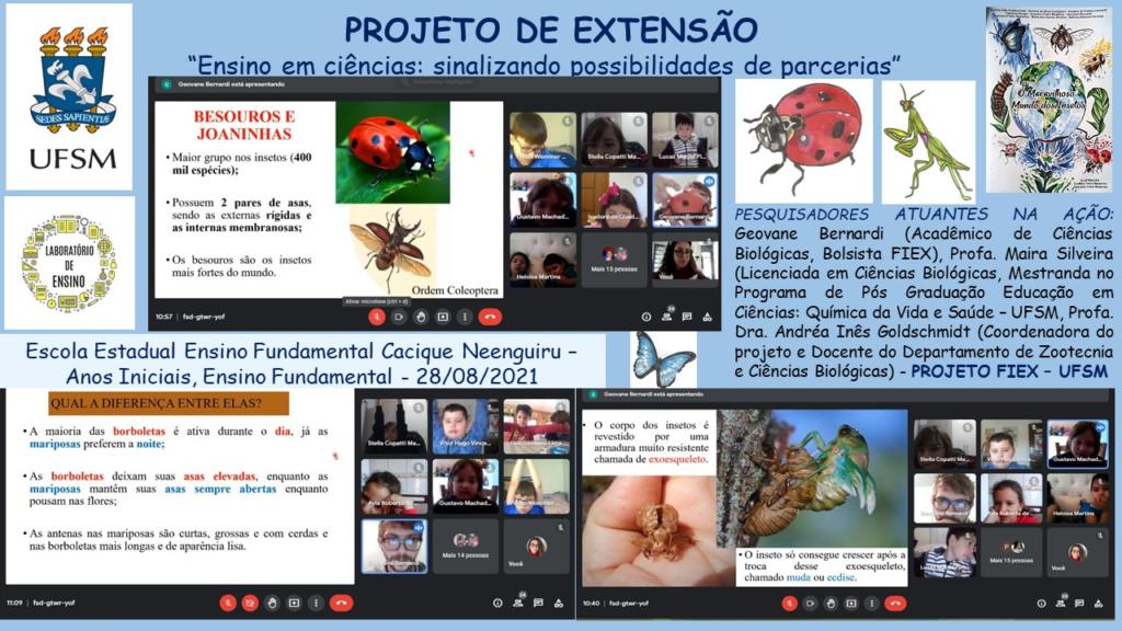 Trata-se de um projeto de conscientização sobre a importância dos insetos, junto aos professores e alunos de anos inicias das escolas parceiras. As palestras têm ocorrido em ambiente remoto, em parceira com as professoras de anos iniciais. Para isso, o grupo utiliza recursos audiovisuais bem como modelos didáticos. Ainda conta com a divulgação do livro “O Maravilhoso Mundo dos Insetos”, em formato e-book, (para leitura) e para baixar, lançado em 2020, na 47ª Feira do Livro de Santa Maria.