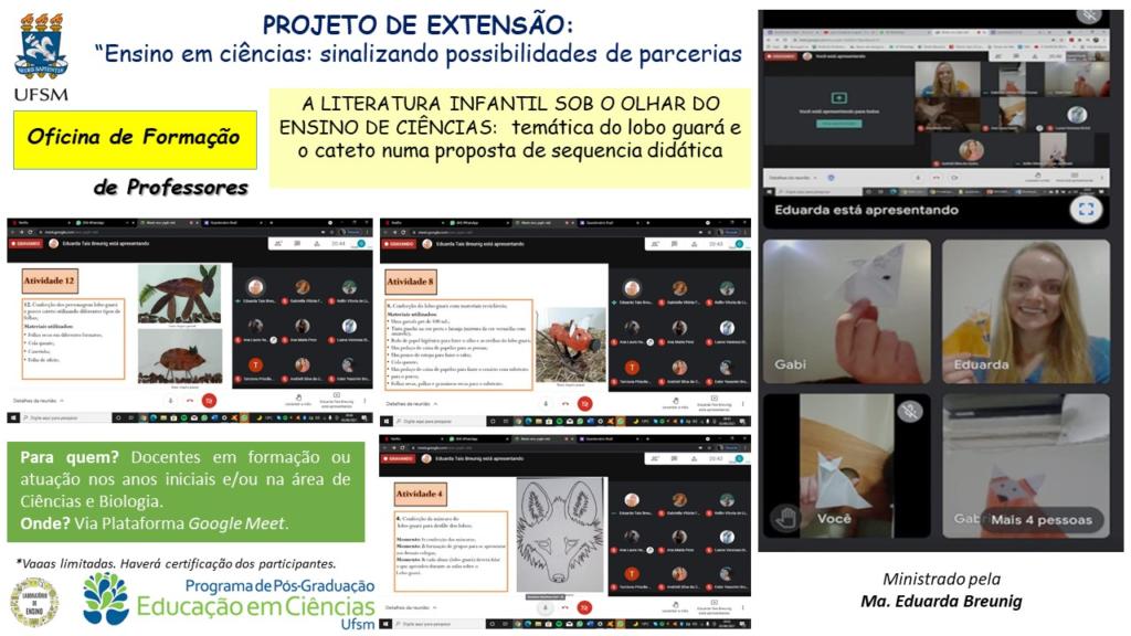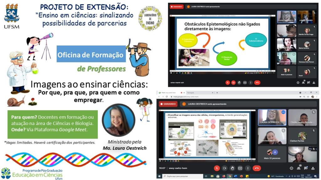Trata-se de oficinas de formação de professores, para professores em formação inicial ou em atuação nos anos iniciais e na área de Ciências, sobre temáticas relacionadas a assuntos voltados ao ensino de ciências, e tem ocorrido desde julho desde ano, também, através do ensino remoto. Atuaram como ministrantes nas oficinas, contribuindo para a formação inicial e permanente de professores, as duas pós-graduandas, do programa Educação em Ciências da UFSM e integrantes do grupo de Extensão junto ao Laboratório de Ensino, Laura Oestreich, e Eduarda Breunig.