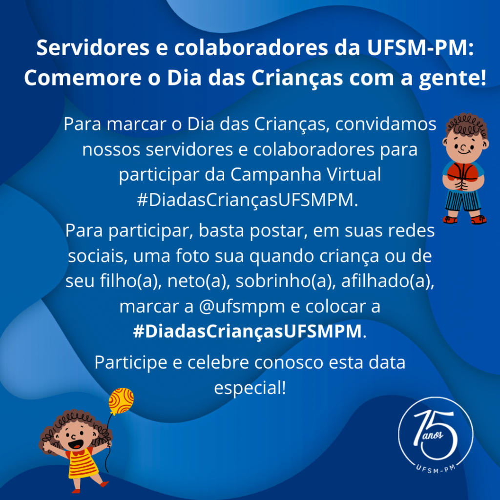 Para marcar o Dia das Crianças, convidamos nossos servidores e colaboradores para participar da Campanha Virtual #DiadasCriançasUFSMPM. Para participar, basta postar, em suas redes sociais, uma foto sua quando criança ou de seu filho(a), neto(a), sobrinho(a), afilhado(a), marcar a @ufsmpm e colocar a #DiadasCriançasUFSMPM.