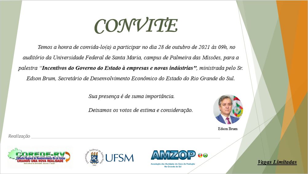 Na próxima quinta-feira (28), às 9h, o Secretário de Desenvolvimento Econômico do Rio Grande do Sul, Sr. Edson Brum, irá ministrar, no Auditório da UFSM Palmeira das Missões, a palestra “Incentivos do Governo do Estado a empresas e novas indústrias”.