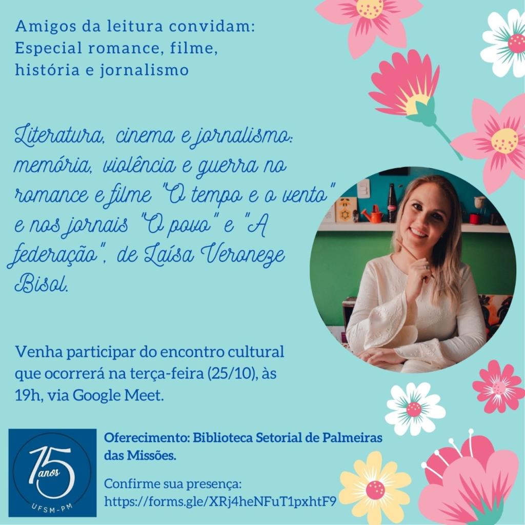 Nesta segunda-feira (25), às 19h, a Biblioteca Setorial de Palmeira das Missões irá realizar o encontro virtual Literatura, cinema e jornalismo: memória, violência e guerra no romance e filme “O tempo e o vento” e nos jornais “O povo” e “A federação”, com a palestrante Laísa Veroneze Bisol.