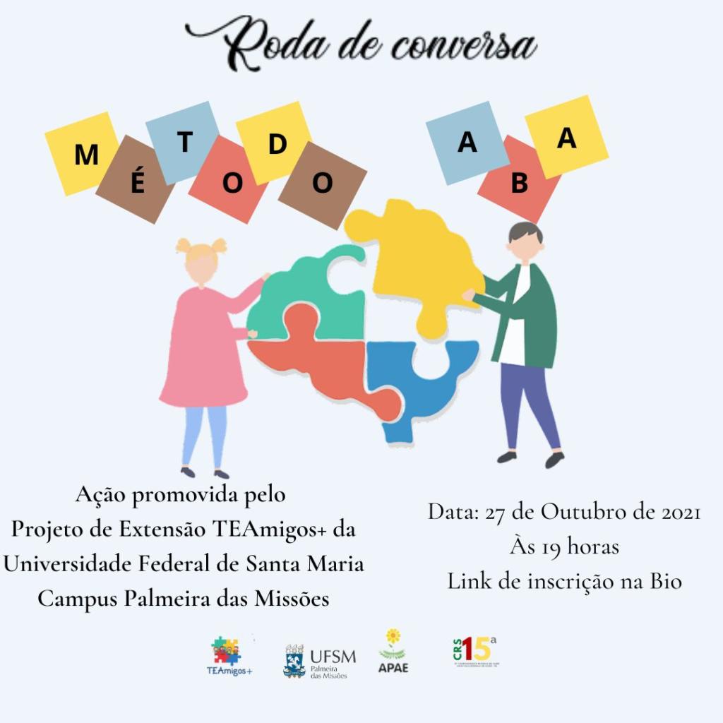 Na próxima quarta-feira (27), o Projeto de Extensão TEAMigos da UFSM-PM, irá realizar uma Roda de Conversa, às 19h, com inscrições abertas no link.  O evento é aberto a toda comunidade acadêmica e demais interessados e terá como tema principal “O Método ABA”. Para tratar do assunto, contará com a presença da psicóloga, professora e Mentora da Academia de Autismo, Shirley Cabral Frazão.