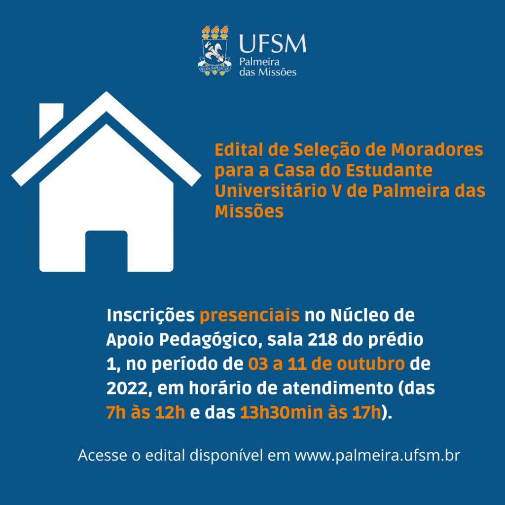 O Núcleo de Apoio Pedagógico da UFSM-PM divulgou, nesta segunda-feira (03), a abertura do Processo Seletivo para a Moradia Estudantil (CEU V) da UFSM, campus Palmeira das Missões. Ao todo, foram ofertadas 10 vagas para estudantes com matrícula e vínculo regular em curso presencial de graduação da UFSM-PM. Para conferir os demais critérios e mais informações acesse o edital clicando aqui. As inscrições vão até o dia 11 de outubro.