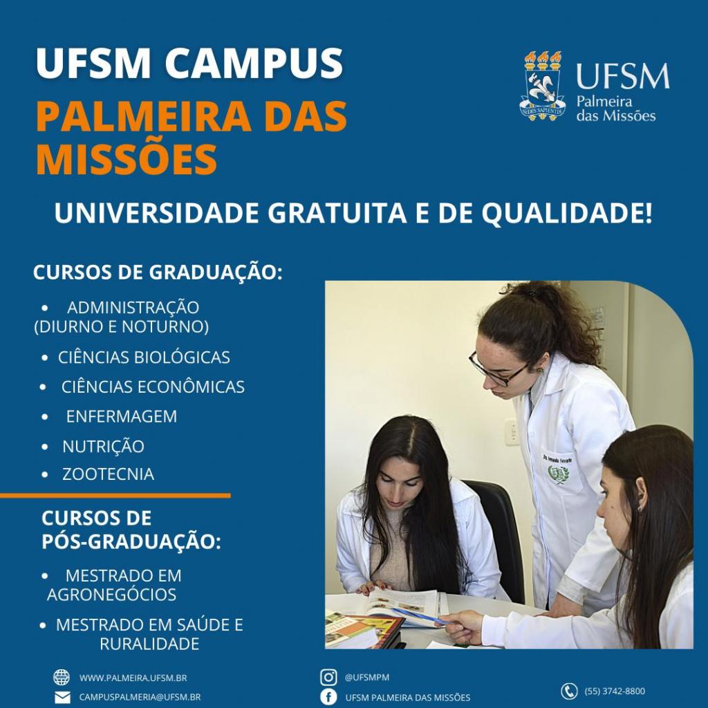 O diretor da UFSM-PM, professor Luiz Anildo Anacleto da Silva, destaca que o campus da Universidade Federal de Santa Maria em Palmeira das Missões é uma universidade que se caracteriza em oferecer cursos de graduação e pós-graduação de excelência e totalmente gratuitos, sendo uma grande oportunidade para a comunidade local e regional. “Para além dos cursos de graduação, com excelentes laboratórios, pessoal técnico especializado, com apoio pedagógico muito interessante para todos os cursos, a universidade também oferta aos alunos de cidades distantes ou com dificuldades socioeconômicas, a possibilidade de morar dentro do próprio campus, pois temos duas Casas do Estudante e também a oferta de três refeições diárias no Restaurante Universitário sem custos para os estudantes com Benefício Socioeconômico (BSE) e, para os demais alunos, um preço ótimo para se alimentar”.