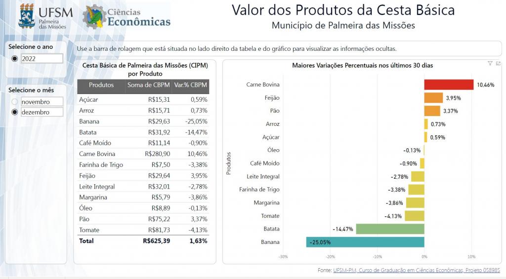 Docentes e discentes do curso de Ciências Econômicas da UFSM Palmeira das Missões iniciaram, no mês de novembro de 2022, uma pesquisa para descobrir o valor da Cesta Básica de Palmeira das Missões (CBPM) e o Cesto Integral de Palmeira das Missões (CIPM).