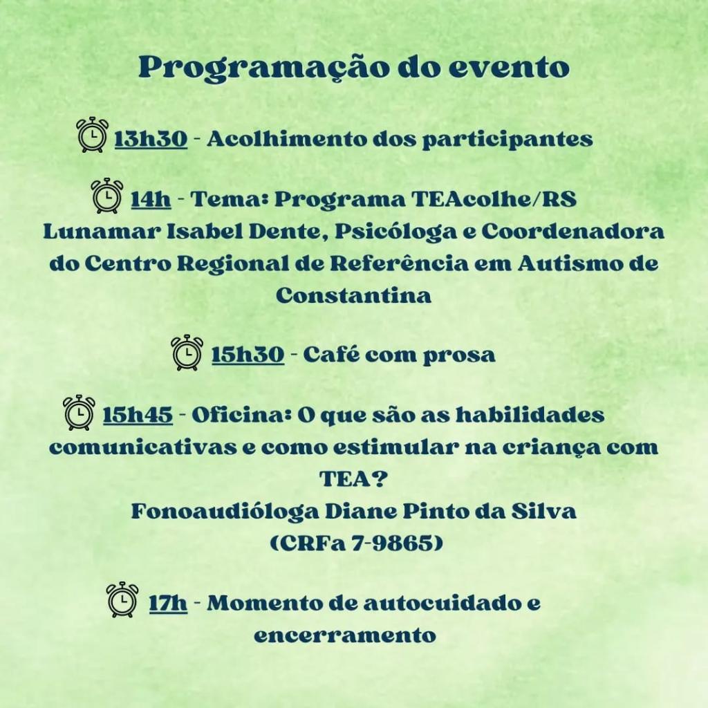 14h – Palestra: Programa TEAcolhe/RS. Ministrante: Lunamar Isabel Dente, Psicóloga e Coordenadora do Centro Regional de Referência em Autismo de Constantina (TEAcolhe)