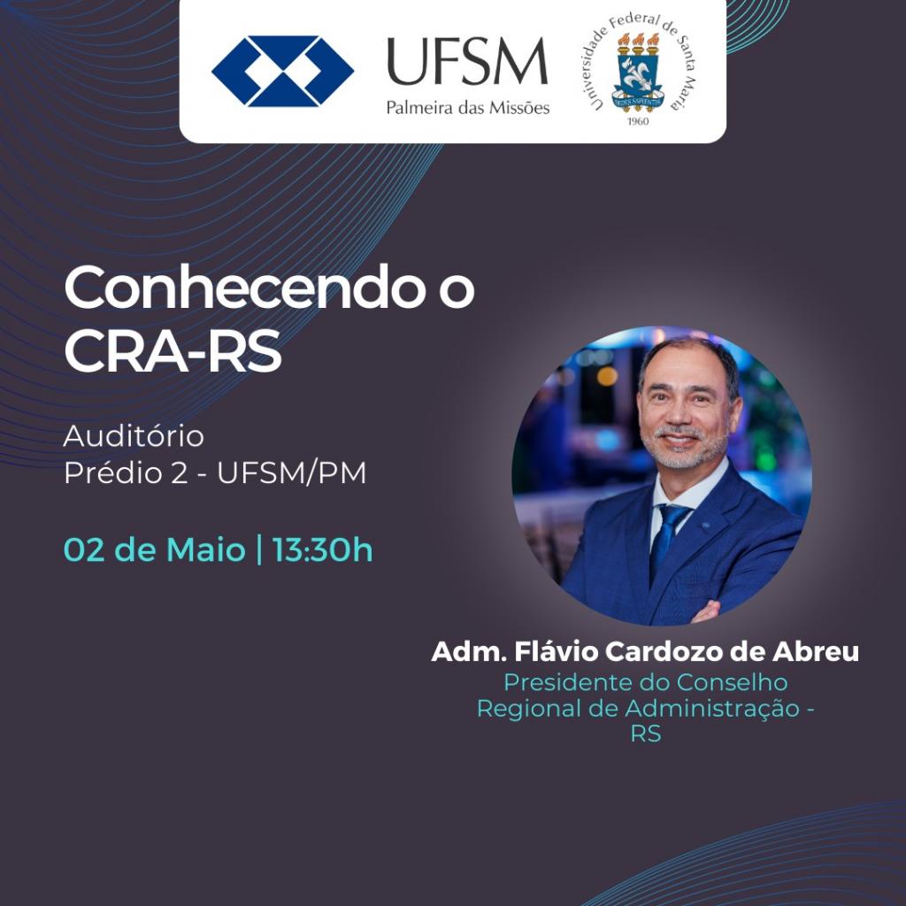 Na próxima terça-feira (02), a UFSM-PM, através do Departamento de Administração, irá promover a palestra “Conhecendo o CRA-RS“, que será ministrada pelo presidente do Conselho Regional de Administração do Rio Grande do Sul, Flávio Cardozo de Abreu.