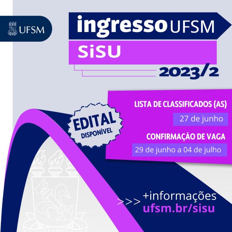 A UFSM publicou, na última sexta-feira (23), o edital Nº 067/2023 da Pró-Reitoria de Graduação (Prograd), referente à Chamada Regular do Sistema de Seleção Unificada (Sisu), para ingresso no segundo semestre de 2023. O edital traz o cronograma para confirmação de vaga e matrícula das pessoas classificadas, bem como modelos documentais e orientações de acesso ao portal da UFSM.