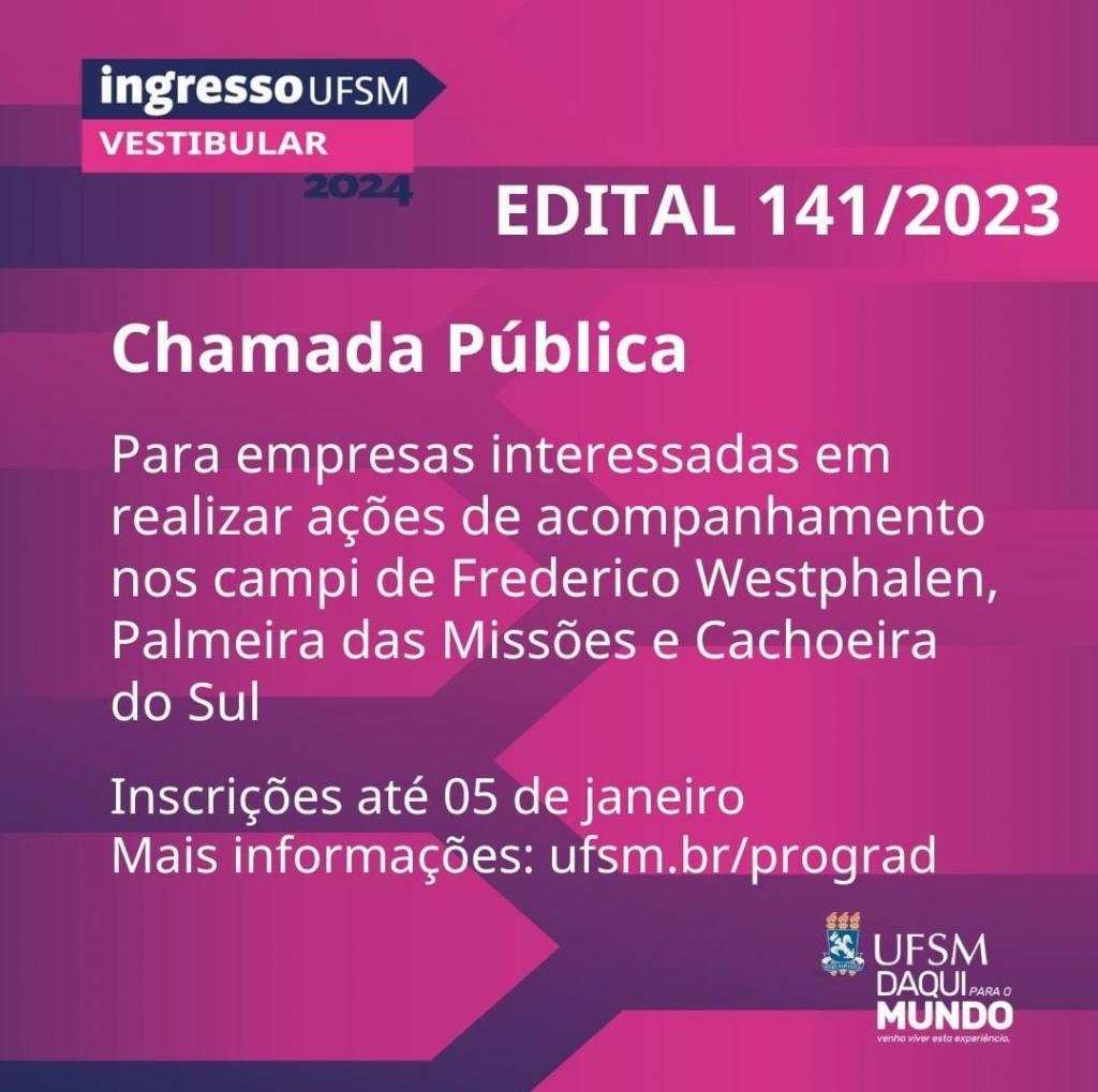 A Pró-Reitoria de Graduação (Prograd) da UFSM publicou a chamada de empresas para cadastramento de ações controladas no âmbito da execução do Processo Seletivo Seriado 1 (PSS-1) e do Vestibular da UFSM, para ingresso em 2024, nos campi fora de sede da UFSM (Cachoeira do Sul, Frederico Westphalen e Palmeira das Missões).