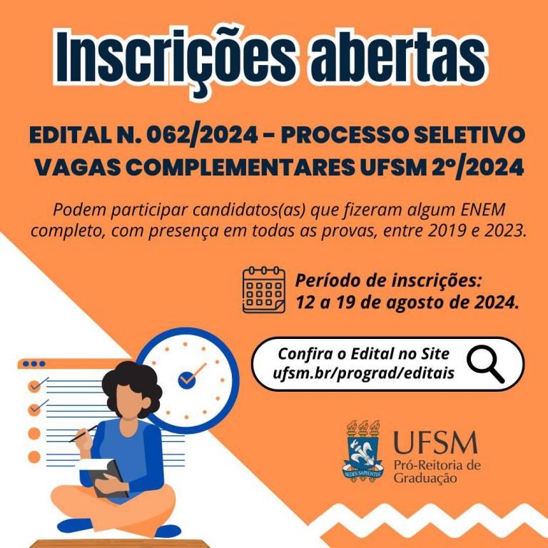 O Edital 062/2024, o Quadro de Vagas e o Sistema de Inscrição podem ser acessados no site da Pró-reitoria de Graduação, em ufsm.br/prograd.
