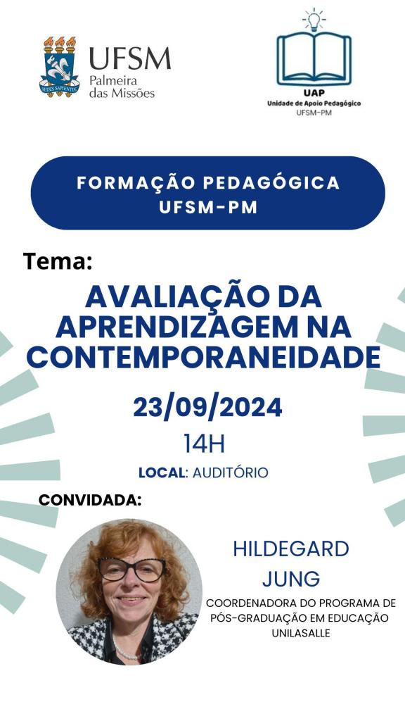 A palestra, promovida pela Unidade de Apoio Pedagógico e Direção do campus, terá como tema “Avaliação da Aprendizagem na Contemporaneidade” e será ministrada pela Coordenadora do Programa de Pós-Graduação em Educação da Unilasalle, Hildegard Jung.