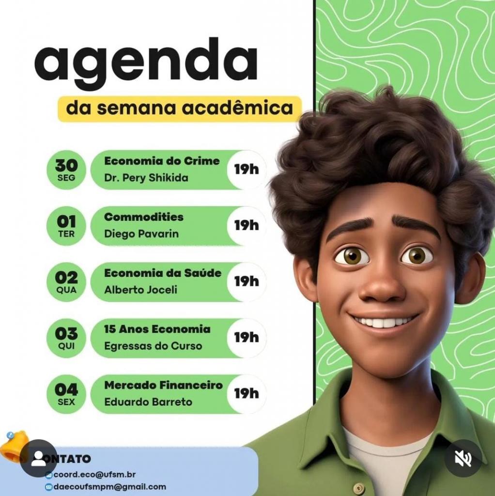 Para conferir a programação completa, siga o perfil do Diretório Acadêmico de Ciências Econômicas (@daeco.ufsmpm) e da Coordenação do curso (economia_ufsmpm).