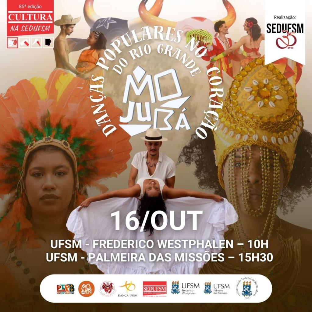O espetáculo “Danças Populares no Coração do Rio Grande” é uma realização do Grupo de Pesquisa LabCRUZO (CNPQ) e do Programa de Extensão “Mojubá: Danças Populares Brasileiras”, pertencentes ao Curso de Dança Licenciatura da UFSM. A apresentação integra, ainda, o Programa de Cultura Popular Brasileira da UFSM, e tem apoio do Cultura Viva 20 anos do Ministério da Cultura – Brasil União e Reconstrução; NEABI (Núcleo de Estudos Afro Brasileiro e Indígena); ODH (Observatório de Direitos Humanos); Dança Licenciatura UFSM; Centro de Artes e Letras; Centro de Educação Física e Desportos; PRE-Extensão e UFSM.