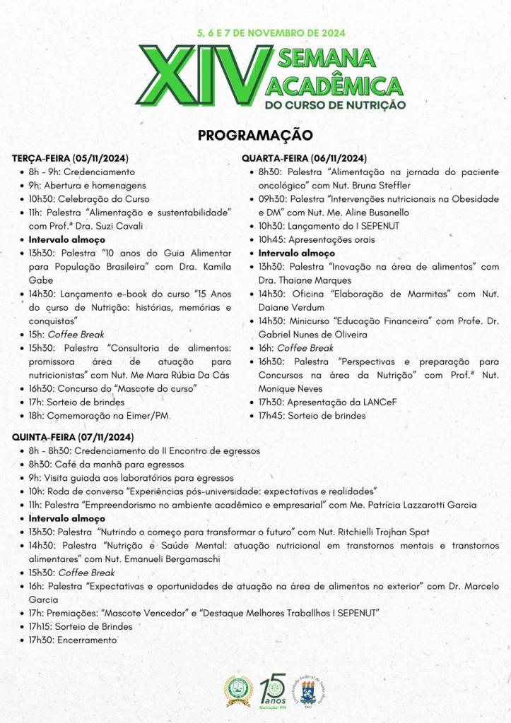 A Semana Acadêmica deste ano será voltada, ainda, aos 15 anos do curso de Nutrição em Palmeira das Missões e contará com diversos momentos de homenagem, dentre eles o Lançamento do E-book “15 anos do curso de Nutrição: histórias, memórias e conquistas”, que será realizado no dia 05 de novembro, às 14h30min. Durante o evento, também será realizado o II Encontro de Egressos do curso de Nutrição, que irá acontecer na quinta-feira, dia 07, a partir das 8h.
