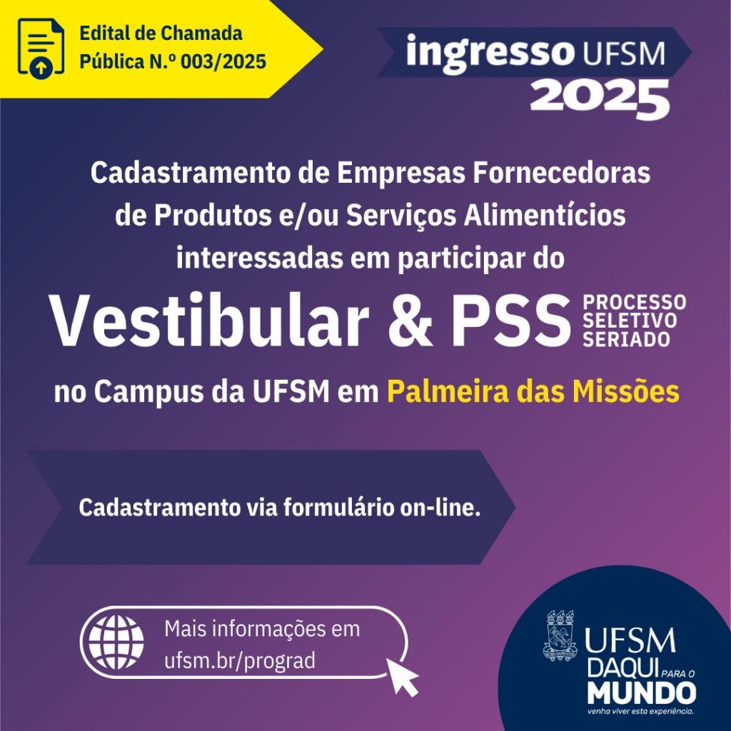 Edital de Chamada Pública para Empresas Fornecedoras de Produtos e/ou Serviços Alimentícios interessadas em participar do Vestibular UFSM 2025 no Campus da UFSM em PALMEIRA DAS MISSÕES