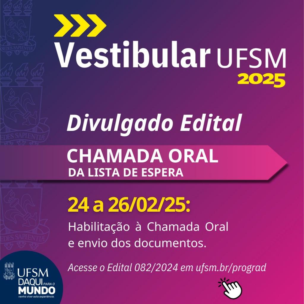 Na tarde de sexta-feira (21), a Pró-Reitoria de Graduação da UFSM publicou o edital Nº 011/2025, que diz respeito à Chamada oral da lista de espera do Vestibular, para os campi de Santa Maria, Cachoeira do Sul, Frederico Westphalen e Palmeira das Missões.
