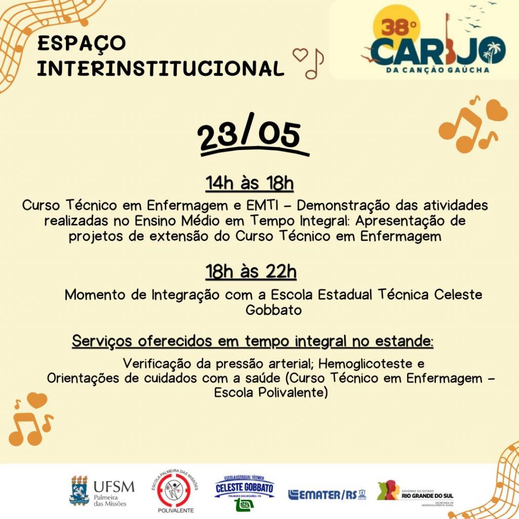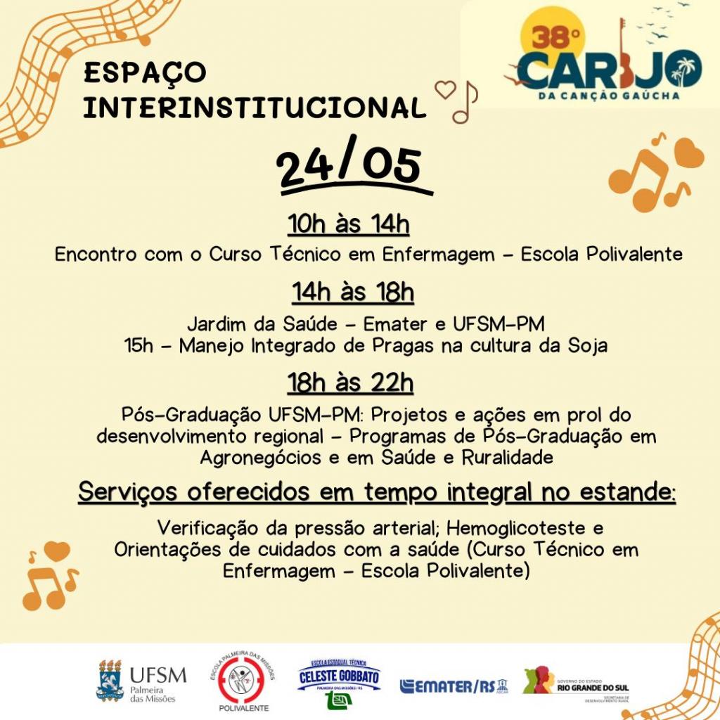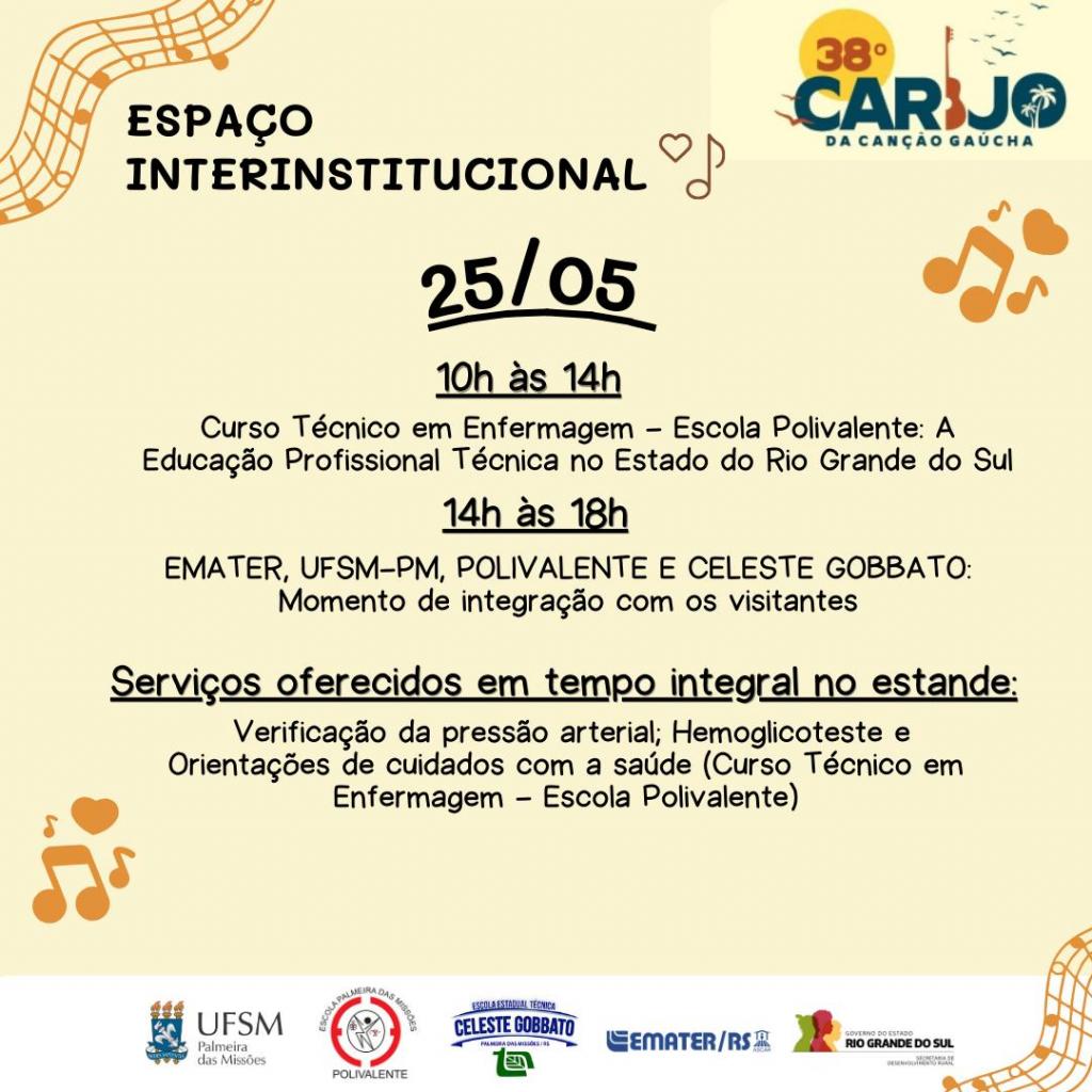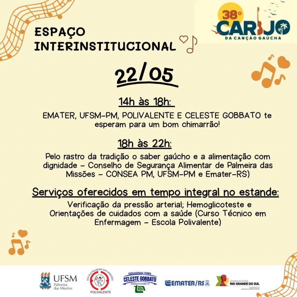 A UFSM campus Palmeira das Missões, EMATER/RS-Ascar, Escola Estadual Polivalente e Escola Estadual Técnica Celeste Gobbato estarão presentes no 38º Carijo da Canção Gaúcha por meio do Espaço Interinstitucional da Mostra da Indústria, Comércio e Artesanato (MIP), promovida no Parque Municipal de Exposições Tealmo José Schardong, de 22 a 25 de maio (quinta a domingo). Em um único espaço, a ação conjunta reúne instituições dedicadas à educação, ao desenvolvimento local e à valorização da cultura gaúcha, prontas para receber os visitantes deste grandioso evento.