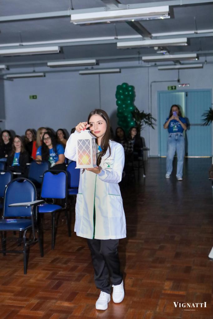 A cerimônia também foi marcada por uma conquista importante: o conceito preliminar 5 atribuído ao curso de Enfermagem. Em um momento simbólico e emocionante, representantes de cada semestre entraram com cinco estrelas, representando a nota máxima e o reconhecimento ao compromisso coletivo com a qualidade da formação.