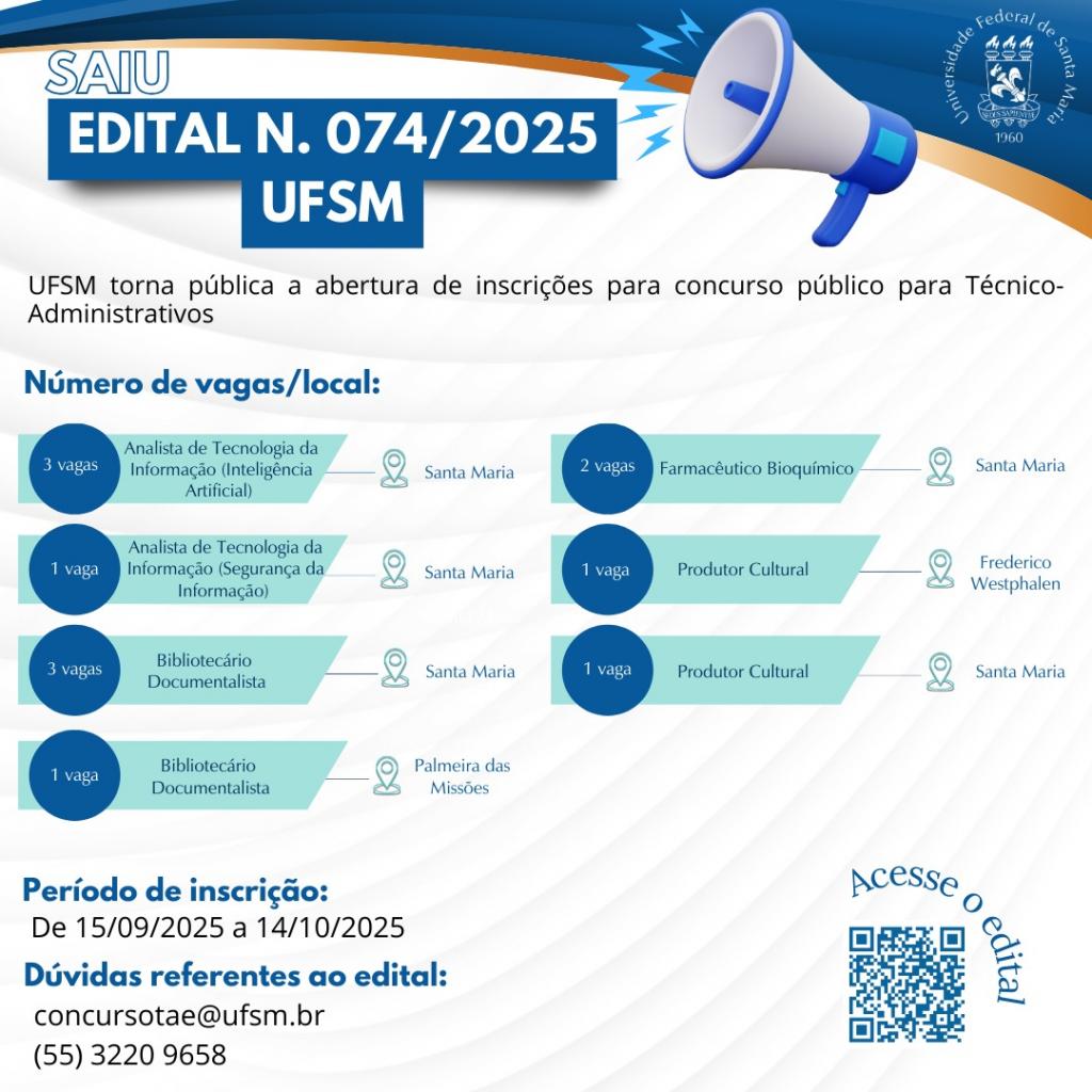 A Universidade Federal de Santa Maria (UFSM) divulgou o Edital nº 074/2025 – PROGEP, para concurso público de técnico-administrativos em educação, com inscrições abertas de 15 de setembro a 14 de outubro de 2025.