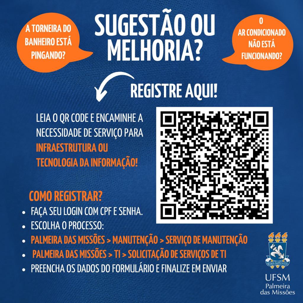 A UFSM campus Palmeira das Missões conta com um canal on-line para facilitar o encaminhamento de sugestões, melhorias ou pedidos de manutenção e tecnologia da informação. Agora, servidores, estudantes e comunidade acadêmica podem registrar suas demandas de forma rápida e prática, por meio do QR Code disponível no card de divulgação ou acessando diretamente o sistema.
