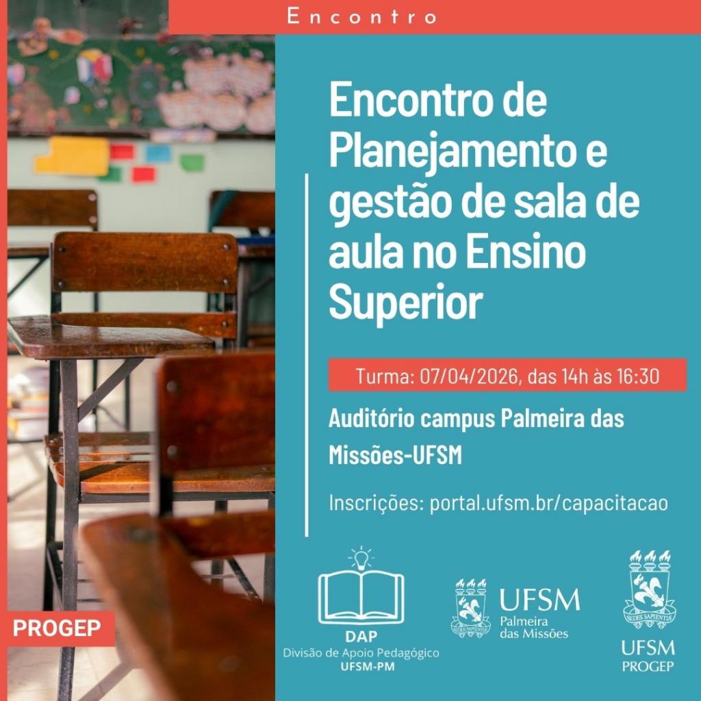 A Universidade Federal de Santa Maria (UFSM), por meio de suas ações de formação docente, promove no dia 7 de abril de 2026, das 14h às 16h30, o Encontro de Planejamento e Gestão de Sala de Aula no Ensino Superior, no Auditório do Campus Palmeira das Missões (UFSM-PM).