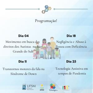 O Projeto de Extensão TEAmigos da UFSM-PM convida toda a comunidade acadêmica e geral para o Ciclo de Palestras alusivo ao mês da Pessoa com Deficiência. Interessados podem realizar sua inscrição no link https://linktr.ee/TEAmigos. O primeiro encontro acontece nesta quarta-feira (04), às 19h. Mais informações, através do instagram @tea_migos.