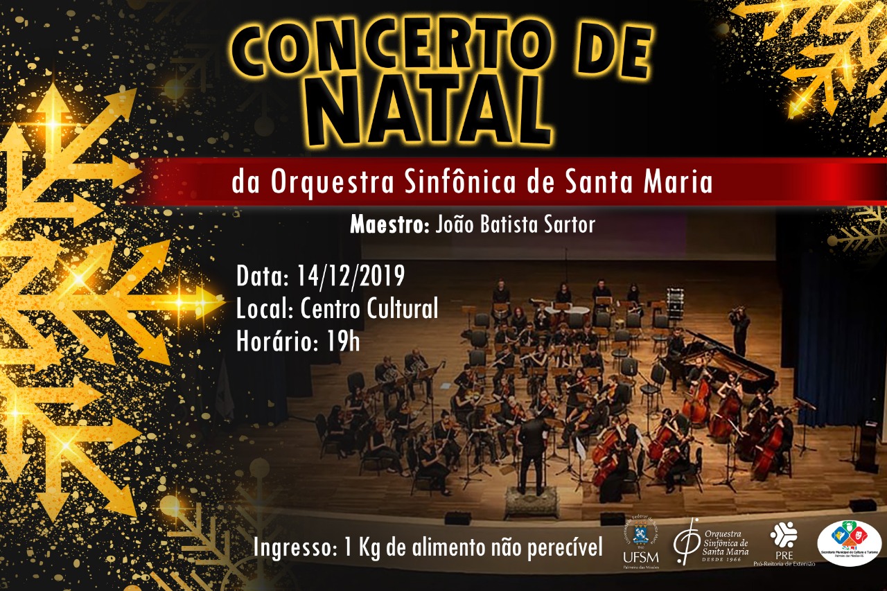 A Universidade Federal de Santa Maria, campus Palmeira das Missões, através da Pró-Reitoria de Extensão da UFSM e com o apoio da Secretaria Municipal de Cultura, traz para Palmeira das Missões, no dia 14 de dezembro, o Concerto de Natal da Orquestra Sinfônica de Santa Maria. A apresentação será realizada no Centro Cultural, a partir das 19h. O ingresso é um quilo de alimento não perecível.